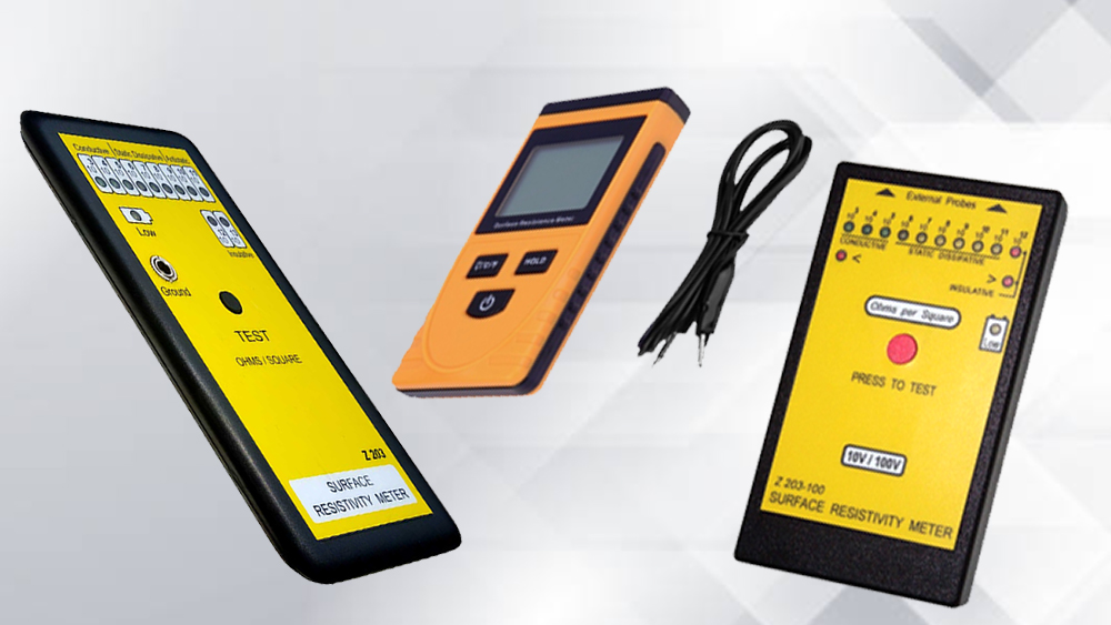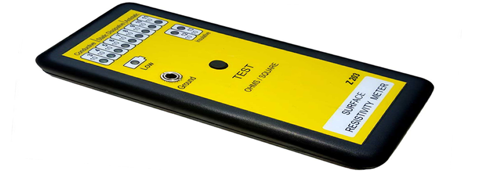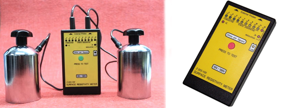 Measures Surface Resistivity or Resistance between 2 points.  Products such as packaging materials, component storage bags and trays, work bench surfaces, table and floor mats, etc., have resistance values which need to conform to stringent specifications. The material characteristics – Conductive, Dissipative and Insulative are conveniently displayed.
